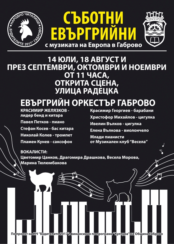 Проектът „Съботни евъргрийни с музиката на Европа“ предвижда организирането на пет издания на съботни евъргрийни през 2018 г. Целта на проекта е да подейства като стимул за възраждане и развитие на клубната музикална сцена и джаз традицията в града. Той ще предложи на слушателите музика с възпитаващо и образователно въздействие, изпълваща сетивата с хармония от мелодичен звук и докосващо душата съдържание на текстовете.