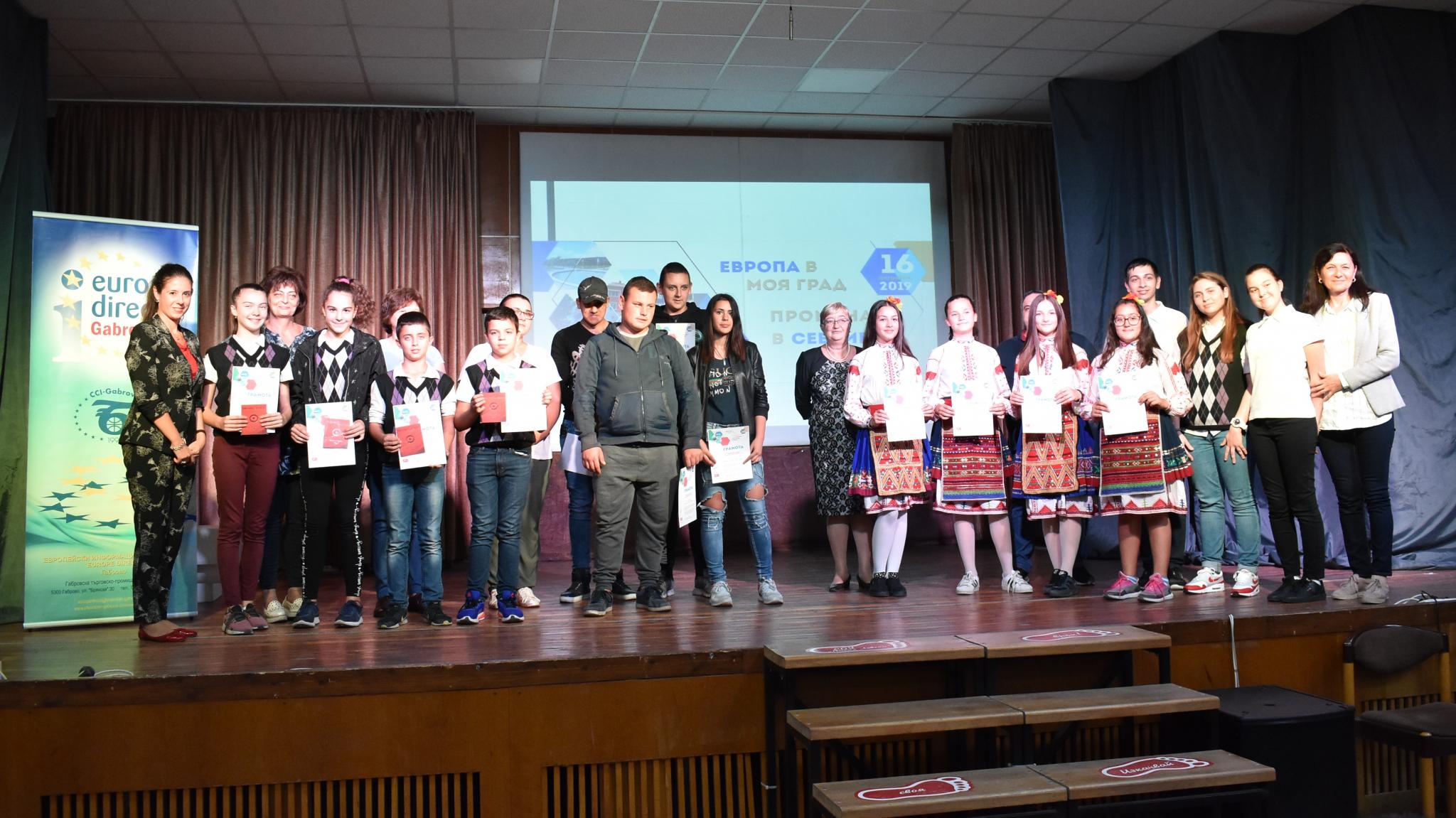 В състезанието „Селфи с Европа“ се включиха по четири отбора от всеки град. В Габрово това бяха участниците от Национална Априловска гимназия, Професионална гимназия за туризъм „Пенчо Семов“ и Професионална техническа гимназия „д-р Никола Василиади“, която се представи с два отделни отбора. В Севлиево 3 от екипите бяха от СУ „Васил Левски“ и един от ПГ "Марин Попов". Изключително силно и запомнящо се участие в Трявна направиха учениците от СУ „Петко Рачев Славейков“, които бяха сформирали 4 отбора. Според регламента на състезанието участниците трябваше да си направят селфи пред посочени три обекта, изградени с европейски средства за всеки конкретен град и да го изпратят на организаторите до определен срок. По време на събитията изпратените снимки бяха показани пред публика, а всеки от отборите представи кратка информация за един от тях, избран по желание. Много от участниците показаха артистичност, прекрасни презентационни умения и познания за обектите, които далеч надхвърлиха предоставената им за тях информация. За журито беше трудно да отличи и награди само по един отбор, затова във всеки град беше присъдена и по една поощрителна награда. Конкурсът „Селфи с Европа“ продължава с гласуване за наградата на публиката. С такава ще бъде отличена снимката на един от отборите, събрала най-много харесвания до 16 часа на 25 октомври 2019 г. на фейсбук страницата на Европа директно Габрово.