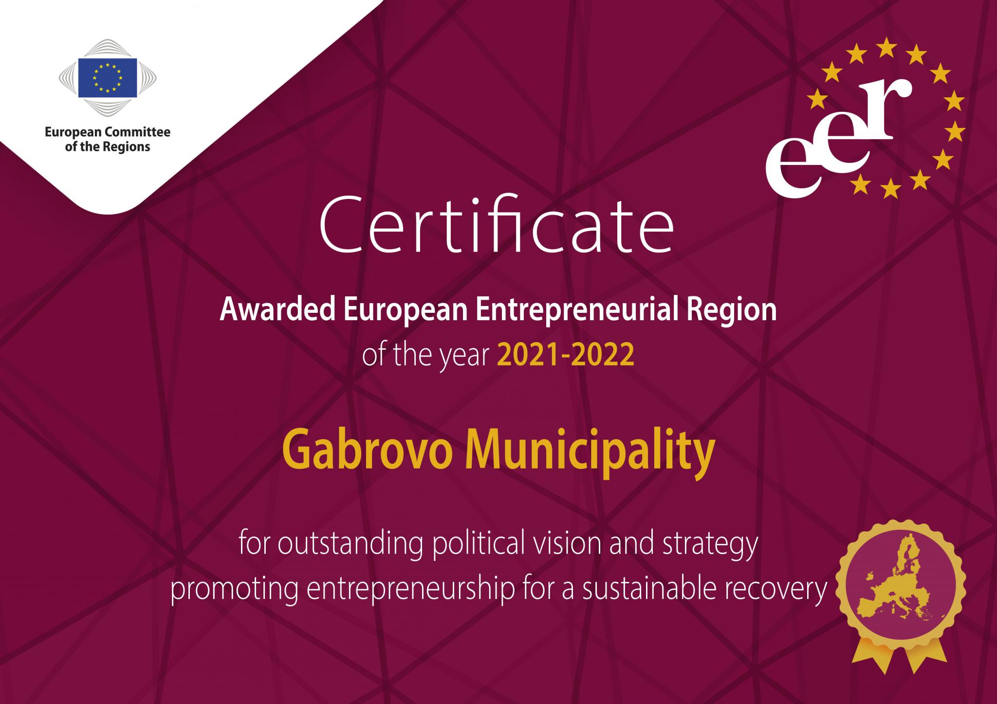 Община Габрово бе избрана за „Предприемчив европейски регион“ (ПЕР) за 2021—2022 г. Европейският комитет на регионите излъчи специално издание на наградата, в което местни и регионални власти имаха възможност да представят стратегии за икономическо и социално възстановяване след Ковид-19. Другите отличени са община Кастело Бранко в Португалия, регион Хелзинки-Уусимаа във Финландия, регион Мадрид в Испания, регион Прованс-Алпи-Лазурен бряг във Франция и Силезкото воеводство в Полша.