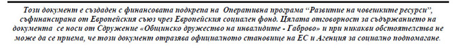 На 3 януари 2011 г. стартира проект „Предоставяне на висококачествена услуга „домашен помощник” чрез грижа в семейна среда за хора с различни видове увреждания и самотно живеещи”. Проектът е на обща стойност 191 135,08 лева и се финансира по Оперативна програма „Развитие на човешките ресурси” по схема за безвъзмездна финансова помощ BG051PO001-5.2-07 „Грижа в семейна среда за независимост и достоен живот на хора с различни видове увреждания и самотно живеещи хора”. Схемата включва дейностите „Социален асистент” и „Домашен помощник” - фаза 3 и е съфинансирана от Европейския съюз чрез Европейския социален фонд. Изпълнител е Сдружение „Общинско дружество на инвалидите” – Габрово в партньорство с Община Габрово. Продължителността на разработката е 14 месеца.