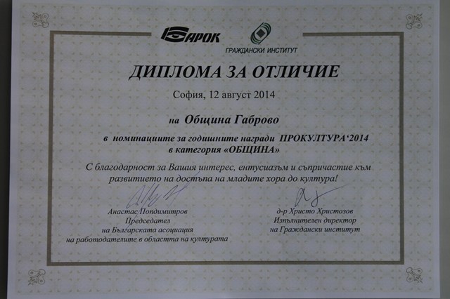 Инициативата на Община Габрово „Приеми ме на село” бе отличена с диплома в номинациите за годишните награди „Прокултура 2014” на Българската асоциация на работодателите в областта на културата (БАРОК).