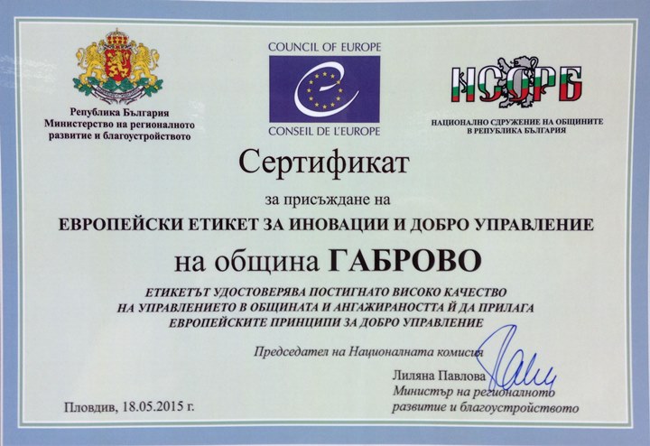Община Габрово е сред 18-те български общини, които са удостоени с престижната награда „Европейски етикет за иновации и добро управление на местно ниво“. Отличието бе връчено на кмета Таня Христова по време на специална церемония в рамките на Годишната среща на местните власти от Югоизточна Европа, която се проведе от 17 до 19 май в Пловдив.