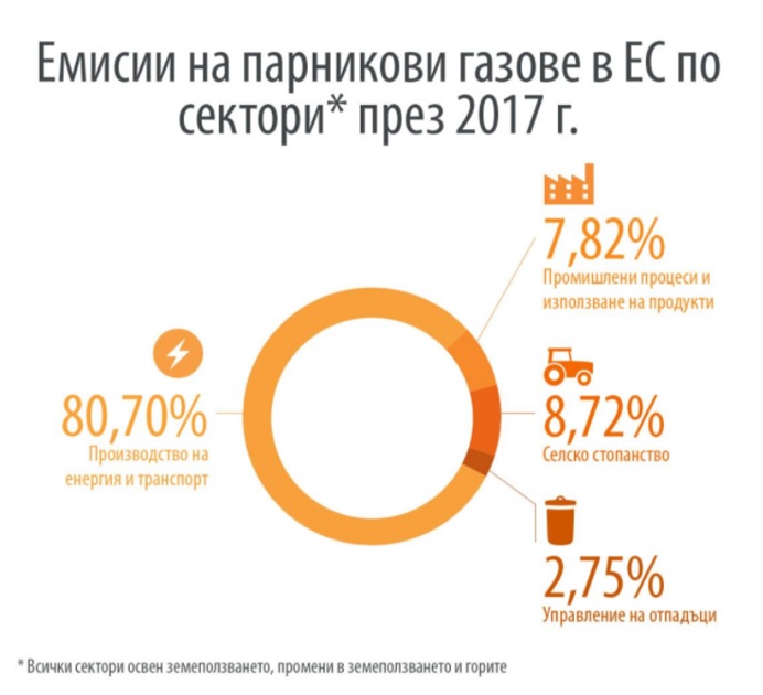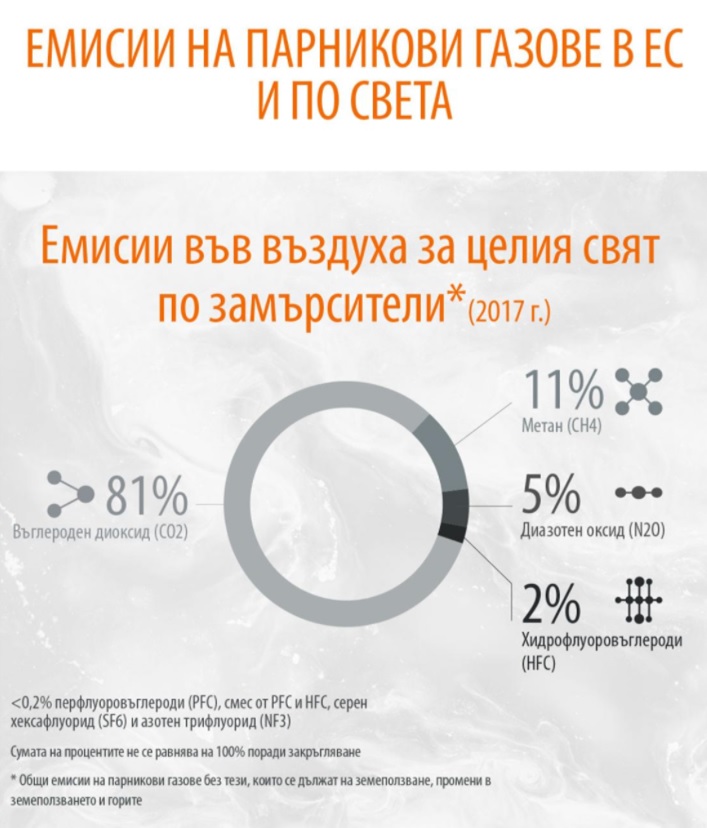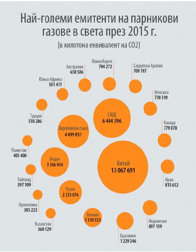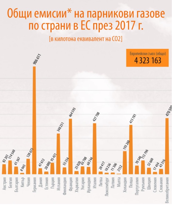 Графиките по-долу показват емисиите на парникови газове по страни в ЕС за 2017 г. и най-големите емитенти в света за 2015 г. Европейският съюз се нарежда на трето място по емисии след Китай и САЩ.