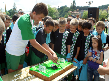 А след последния съдийски сигнал двата отбора получиха футболни топки-реплики на тези, с които се играят финалите от Шампионската лига и огромна торта, с форма на футболно игрище.