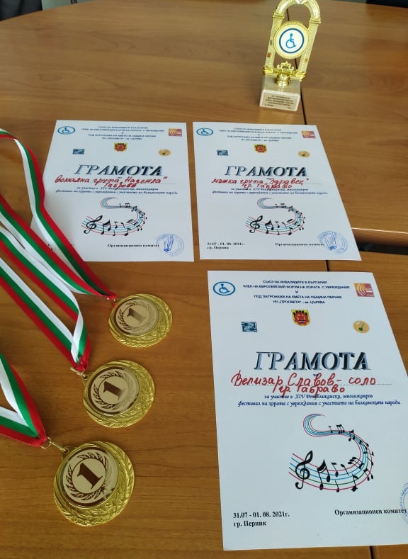 Със 7 медала и плакет за цялостно представяне се завърнаха вокалните групи към Сдружение „Общинско дружество на инвалидите – Габрово“ от XIV Републикански многожанров фестивал на хората с увреждания в Перник. Във форума се включиха 250 състава и над 1800 участника.