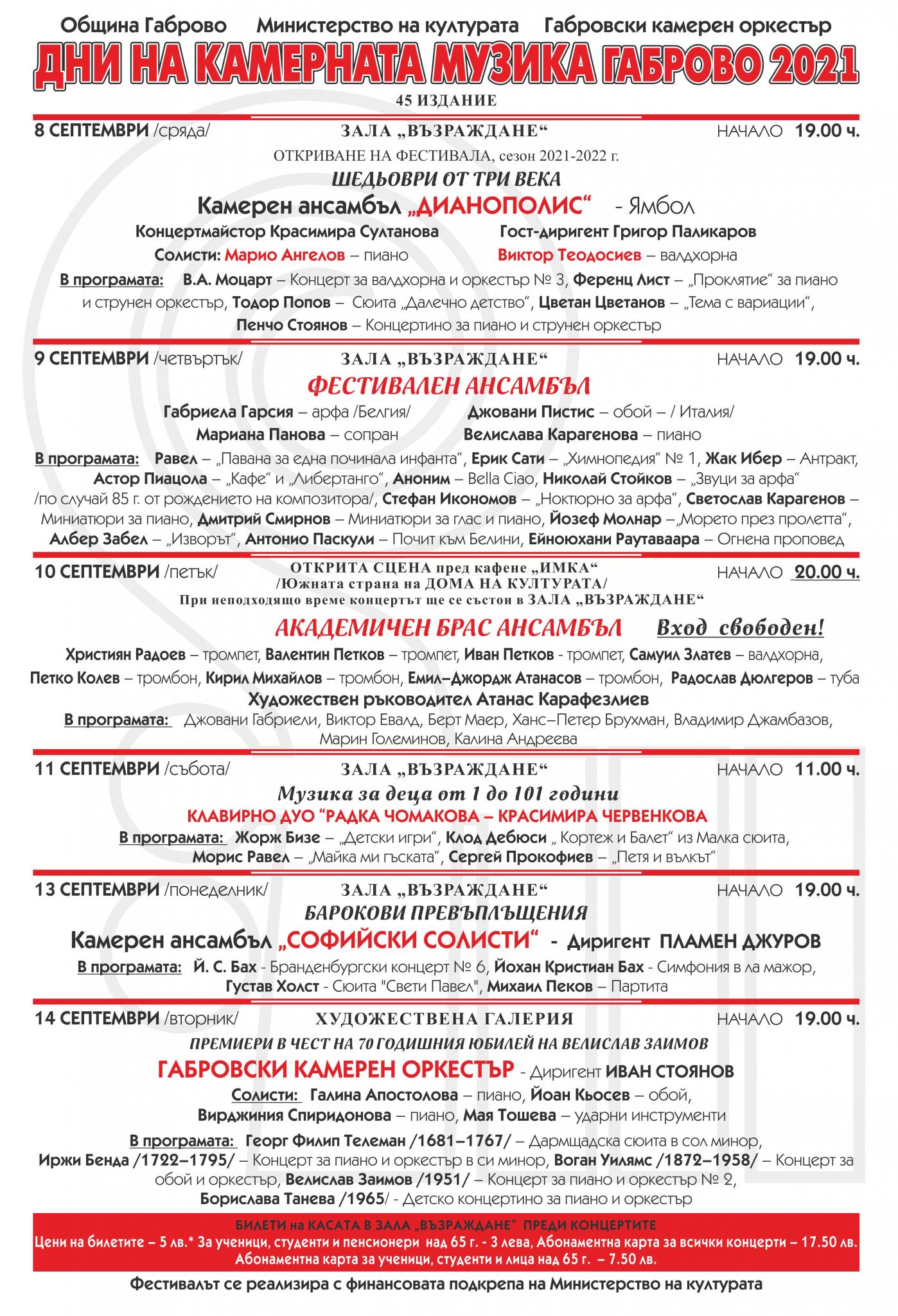 На 14 септември, вторник, от 19:00 часа, в зала „Възраждане“, 45-то издание на Дни на камерната музика Габрово 2021 ще се закрие от Габровски камерен оркестър. Програмата предлага музикална разходка от първата половина на 18 век до 2021 г. За пръв път в България ще се изпълнят „Дармщадска танцова сюита“ от немския бароков композитор Георг Филип Телеман, Концерт за пиано и оркестър от чешкия предкласик Иржи Бенда, Концерт за пиано и оркестър № 2 от изтъкнатия български композитор Велислав Заимов, Концерт за обой и оркестър от Вогън Уилямс и „Малък концерт“ за пиано и оркестър от Борислава Танева. Солисти ще бъдат пианистите Галина Апостолова, Вирджиния Спиридонова и обоиста Йоан Кьосев.