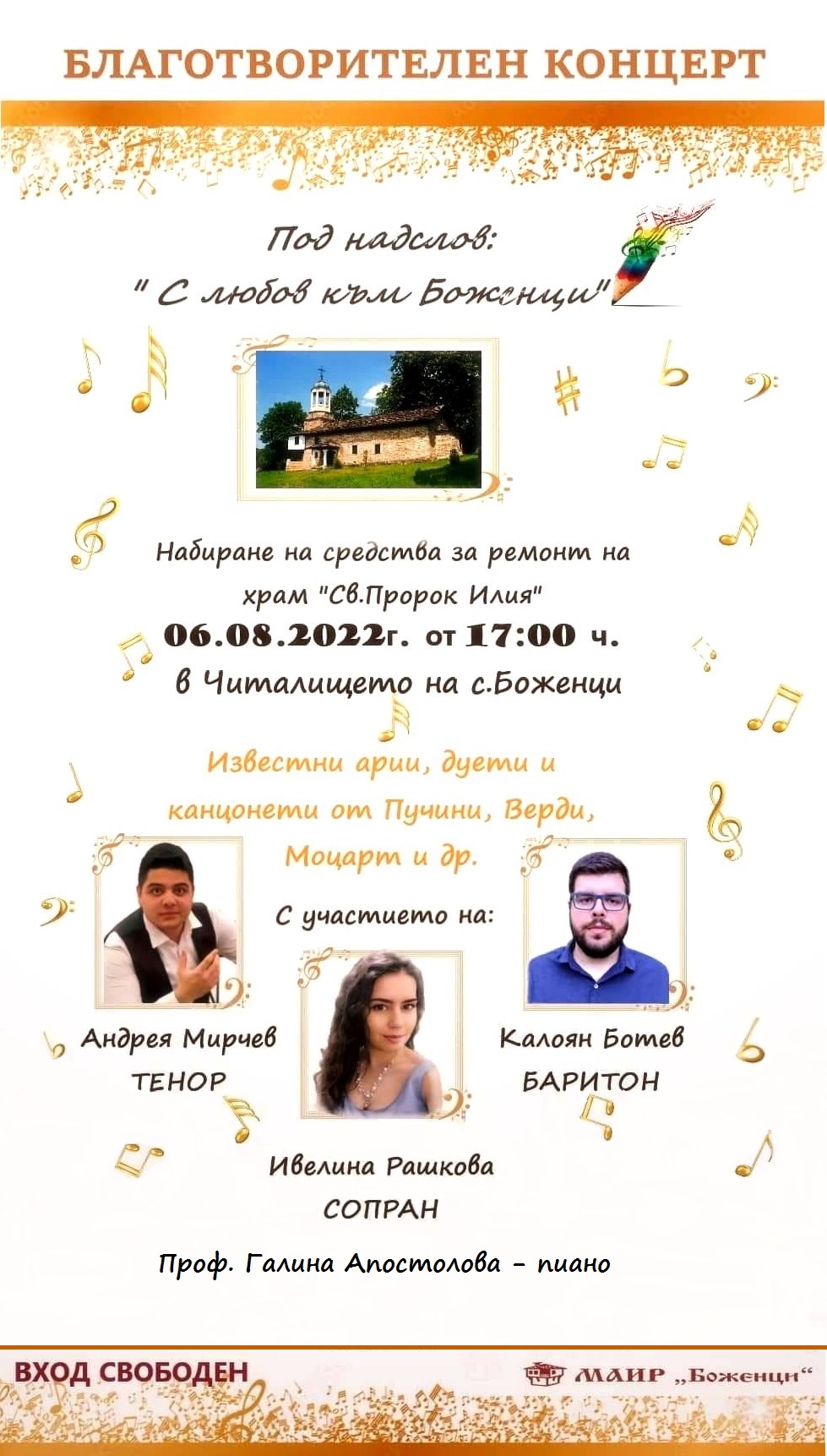 Благотворителен класически концерт ще се състои тази събота – 6 август, от 17:00 часа в сградата на Старото школо в село Боженци. Каузата за набиране на средства е посветена на църковния храм „Свети Пророк Илия“, който се нуждае от ремонт.