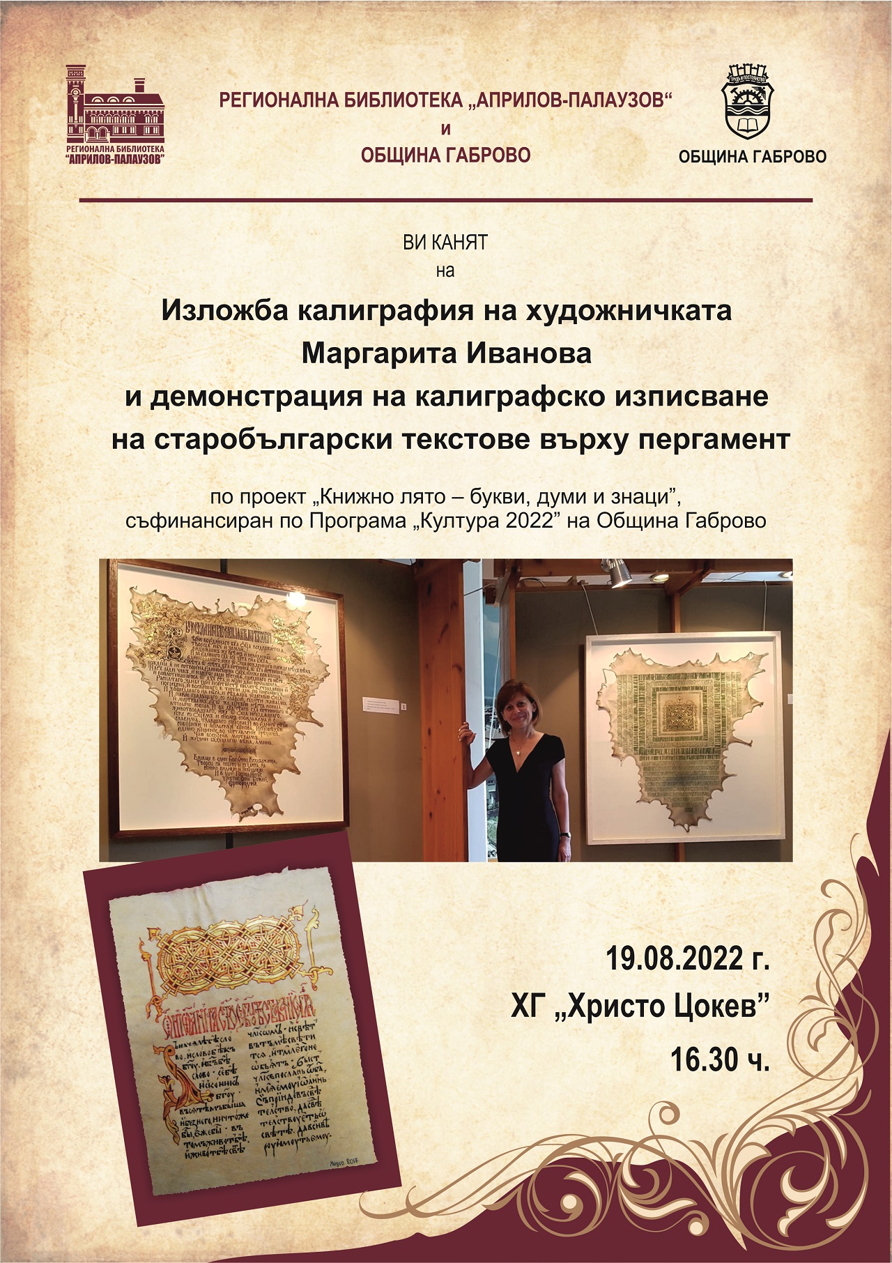Калиграфия върху пергамент ще покаже в самостоятелна изложба в Габрово калиграфът и художник Маргарита Иванова. Творбите ѝ ще бъдат експонирани в Художествена галерия „Христо Цокев“ на 19 август 2022 г. от 16:30 часа.