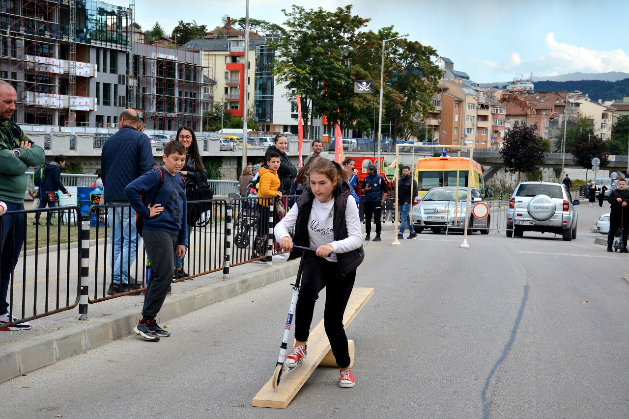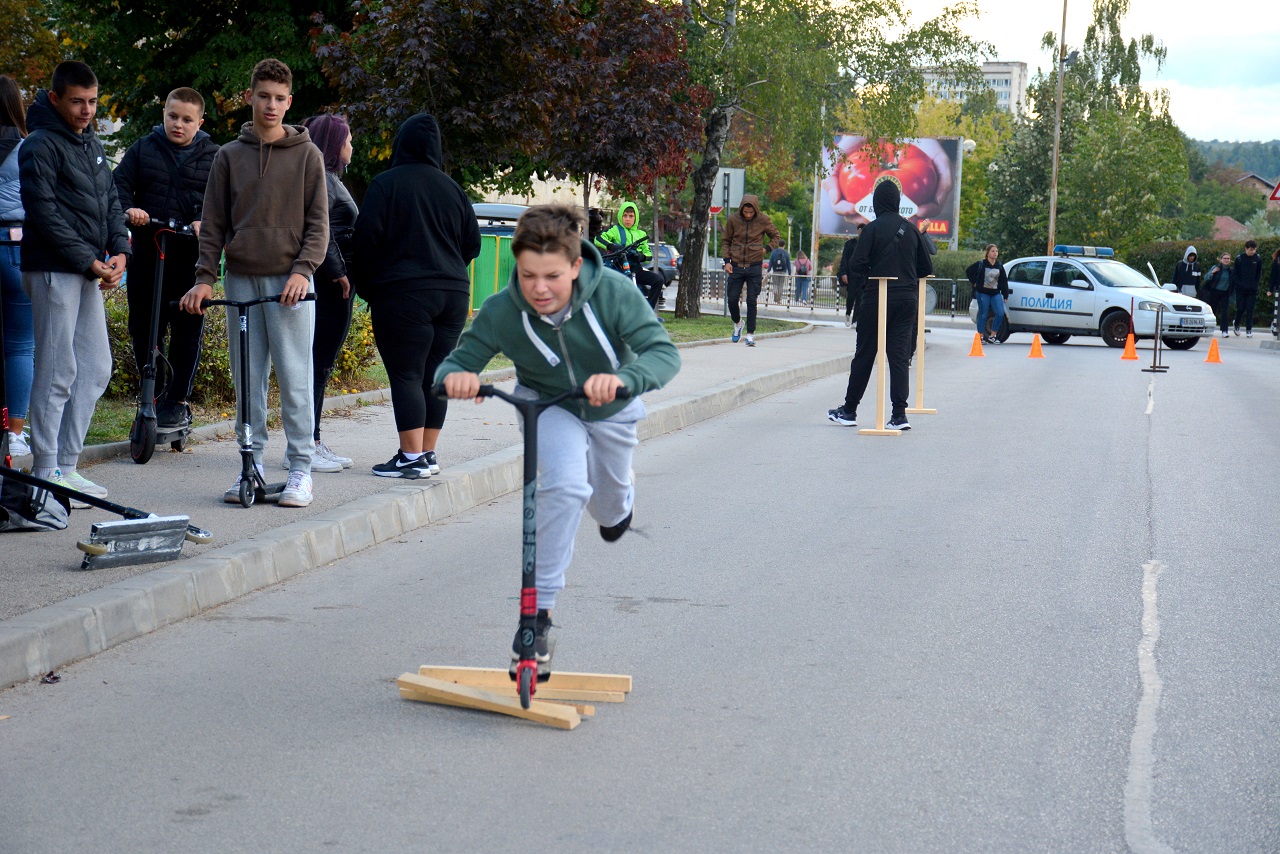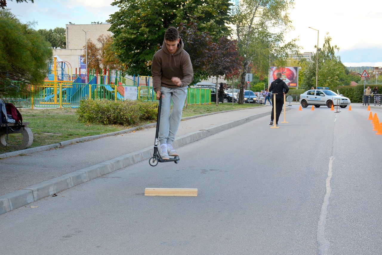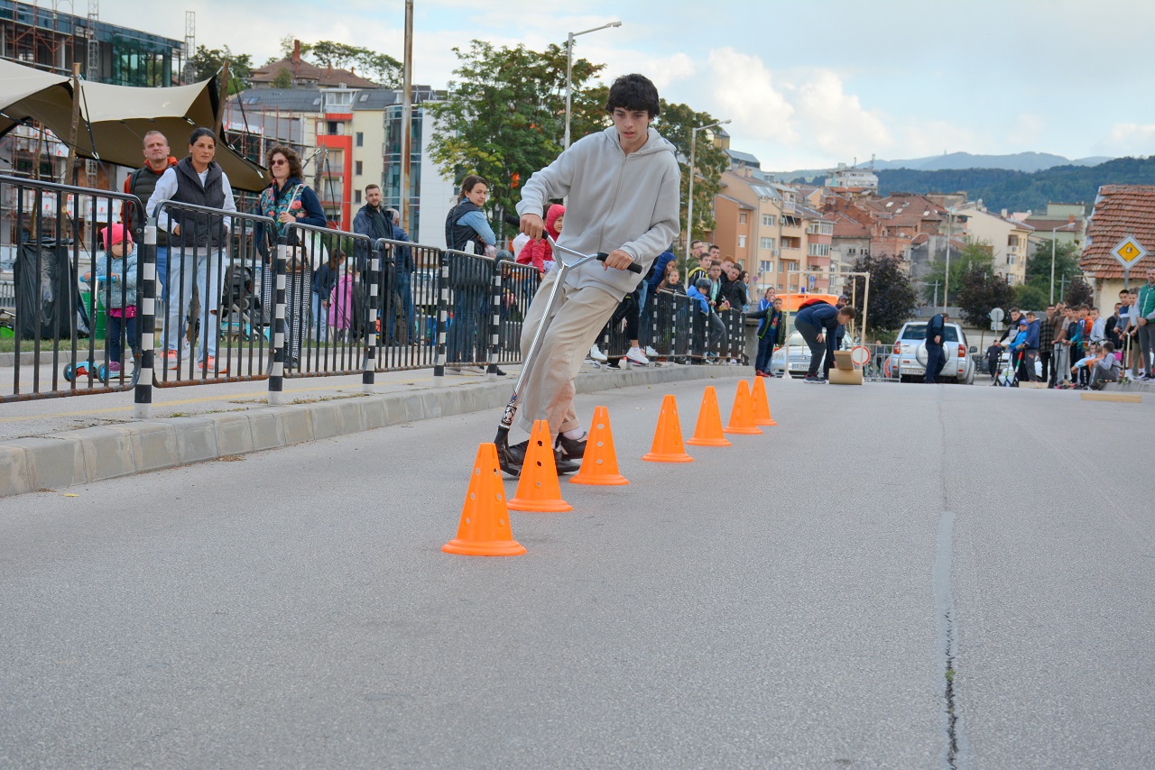 Деца и младежи с тротинетки участваха в демонстрационно състезание, което се проведе вчера на улица „Аврам Гачев“. На импровизираната спортна площадка 31 любители на малките колелца показаха умения за виртуозно придвижване.