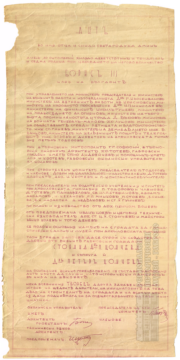 В основите на постройката се полага специално художествено изработен и поставен в метална кутия Акт. В него са посочени денят и годината, името на Цар Борис III, изброено е поименно правителството, имената на Великотърновския митрополит и районния архитект, габровския околийски управител, кмета и помощник-кмета на Габрово, членовете на Родителско- учителския съвет при гимназията, членовете на строителния комитет, архитекта на сградата, не са забравени предприемачът и майсторите, които ще съграждат зданието.