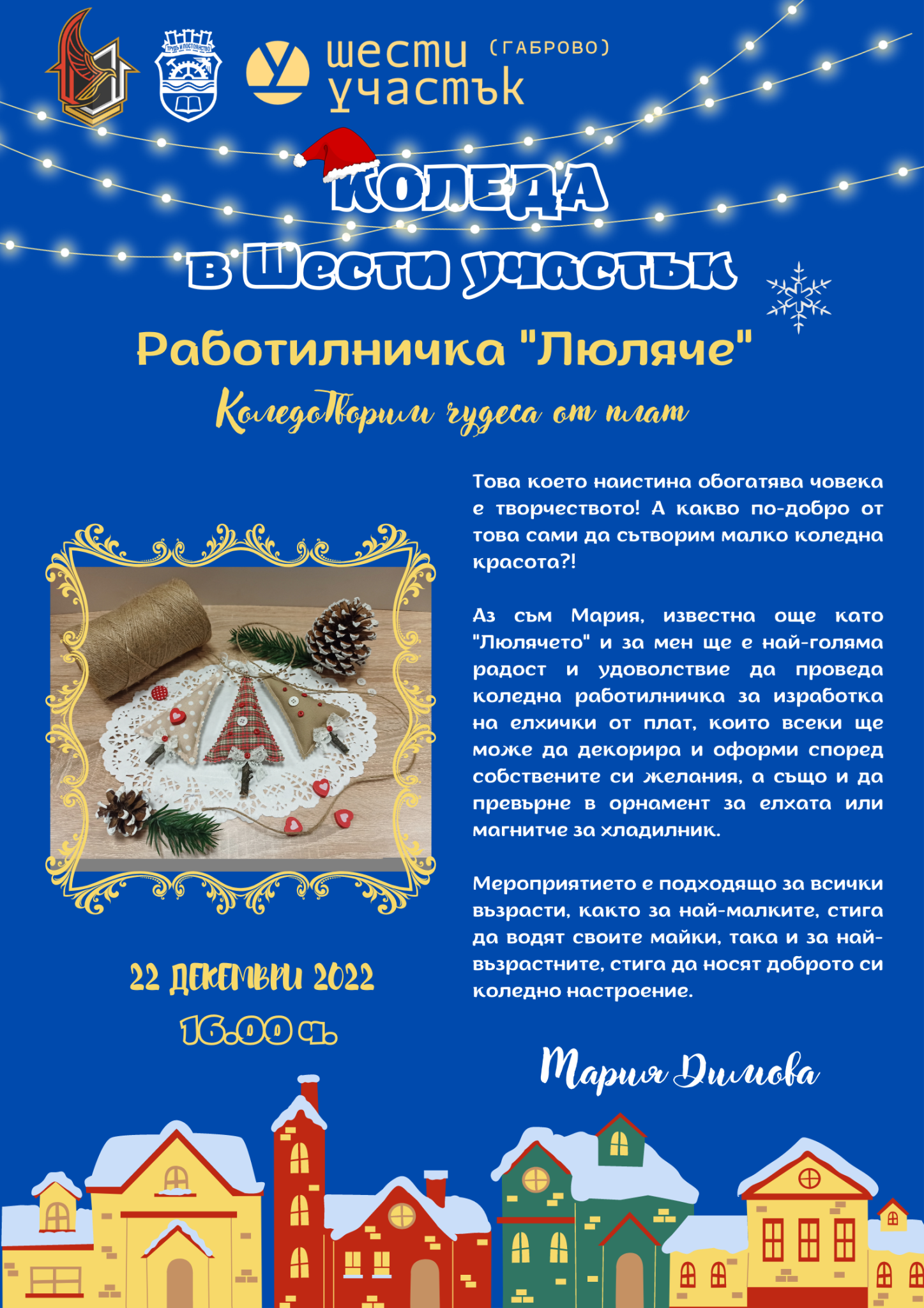 Малко преди Коледа Мария открехва вратичка към майсторенето на коледни елхи от плат, за да може всички вие - независимо от възрастта си, да позволите на въображението да ви завладее. Работилничка "Люляче" обещава на всеки, който се включи, добро настроение и красиви творения. Мария ще ви очаква в Шести участък, а вие си вземете усмивката на идване!