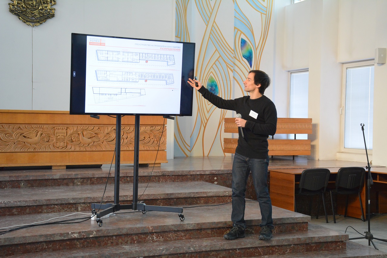Арх. Станимир Семов представя дипломната си работа „Преустройство на промишлена зона в гр. Габрово – фабрика „Успех“ © Община Габрово