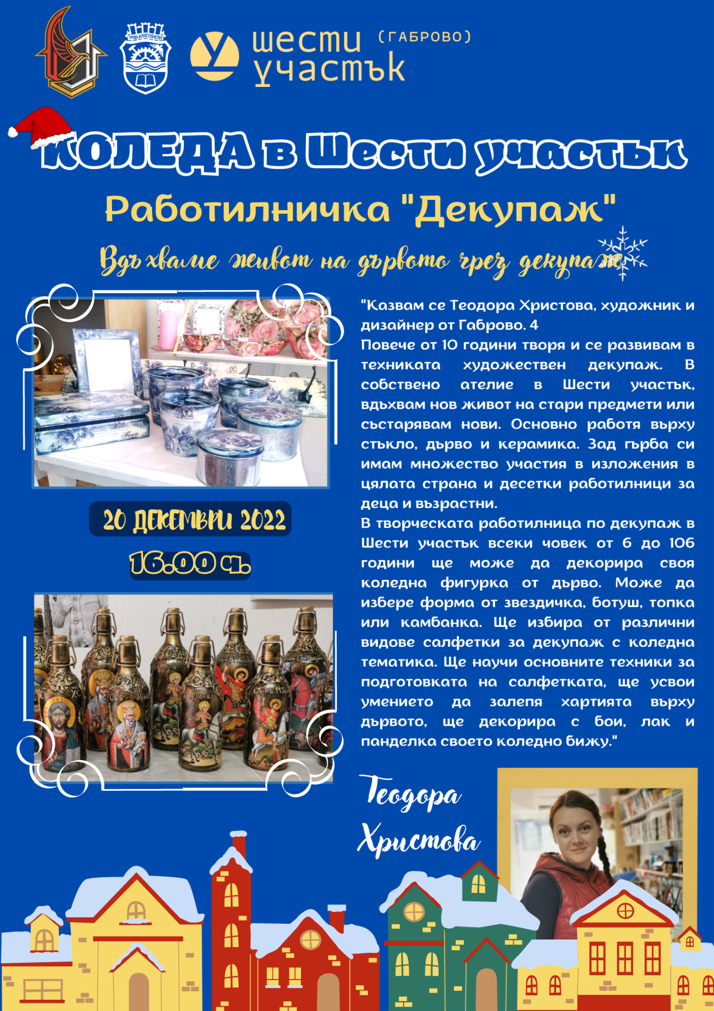 Също днес от 16,00 до 18,00 ч. вдъхваме живот на дървото чрез техниката декупаж в Туристически информационен център. Очакват ви коледна атмосфера и майстор, който ще ви покаже, че декупажът не е толкова труден, колкото звучи.