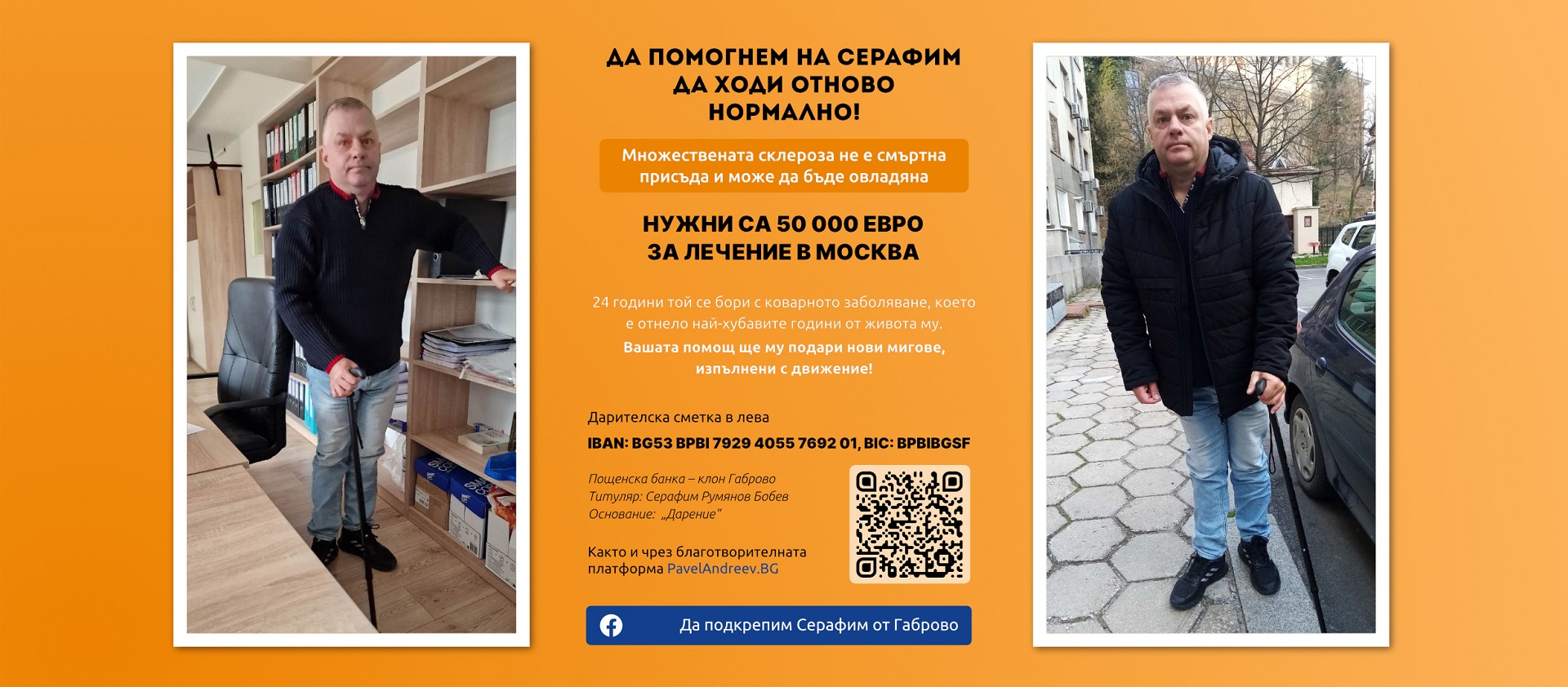 Чрез дарителска сметка в лева: IBAN: BG53 BPBI 7929 4055 7692 01, BIС: BPBIBGSF, Пощенска банка – клон Габрово, титуляр: Серафим Румянов Бобев, основание: „Дарение“.