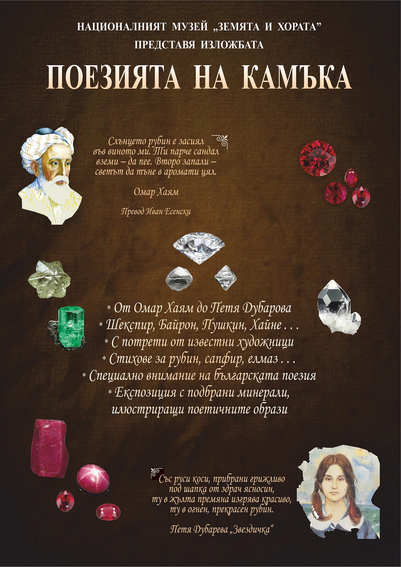 Редом с поетични творби посетителят може да се наслади на подбрани експонати от рубин, сапфир, смарагд, кварц, нефрит, мрамор и други, които сами по себе си могат да се нарекат „природно изкуство“.