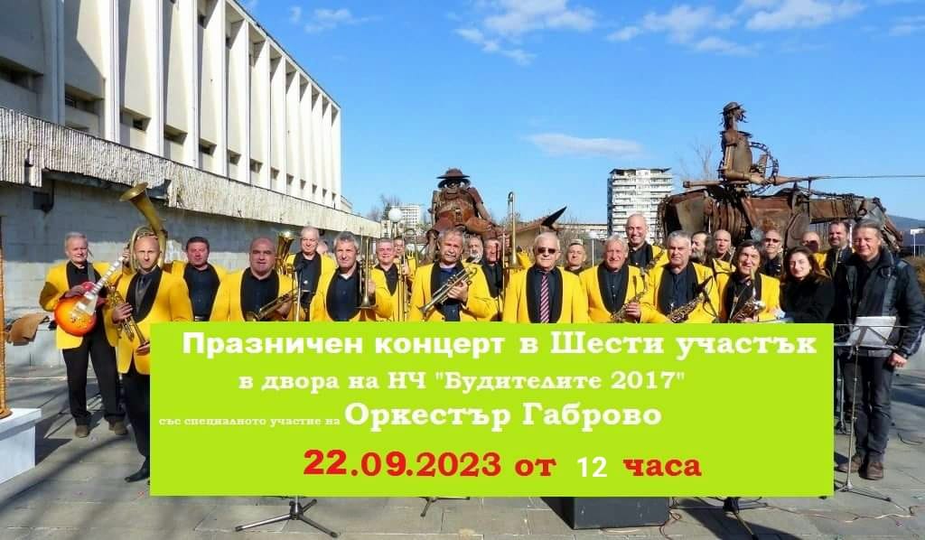 В 12:00 часа Оркестър "Габрово" кани своите почитатели, гости на Габрово и всички от квартал Шести участък на празничен концерт в двора на Народно Читалище "Будителите 2017"