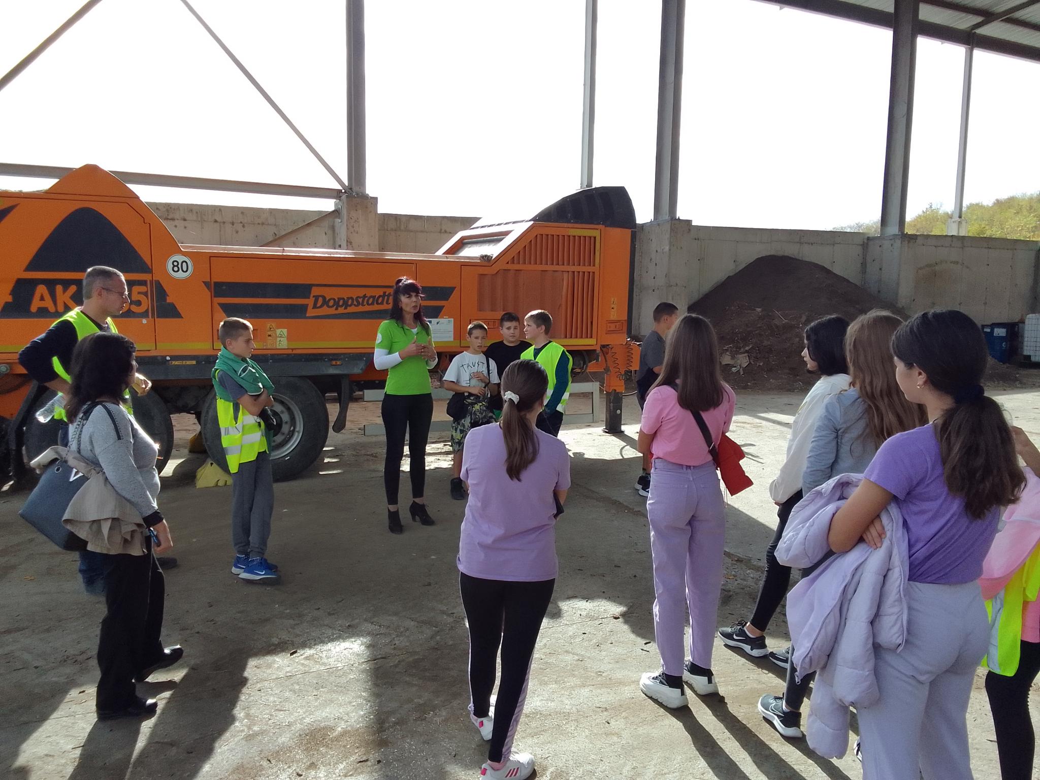Следващата спирка от обхода беше площадката за компостиране, където учениците се запознаха с функционирането на машините и научиха как биоразградимите отпадъци се превръщат в компост и какви предимства за почвата има той.