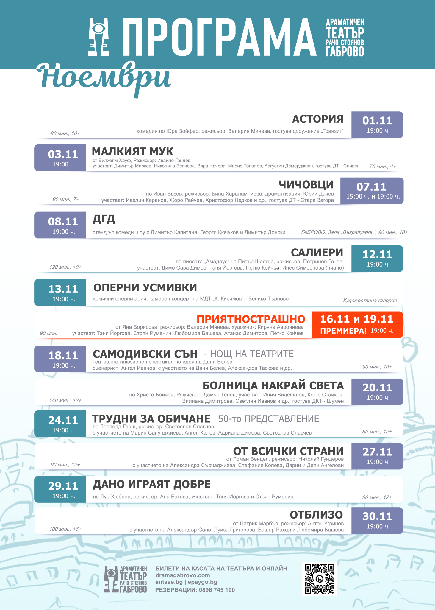 За 6-та поредна година Габровският театър предлага на своите зрители от Габрово и от цялата страна възможността да се сдобият с билети за постановките през ноември на преференциални цени. В деня, в който честваме всички знаменити българи, допринесли за възхода и запазването на духа, културата и народа ни, даваме възможност на нашите зрители по-лесно да се докоснат до изкуството и културата.
