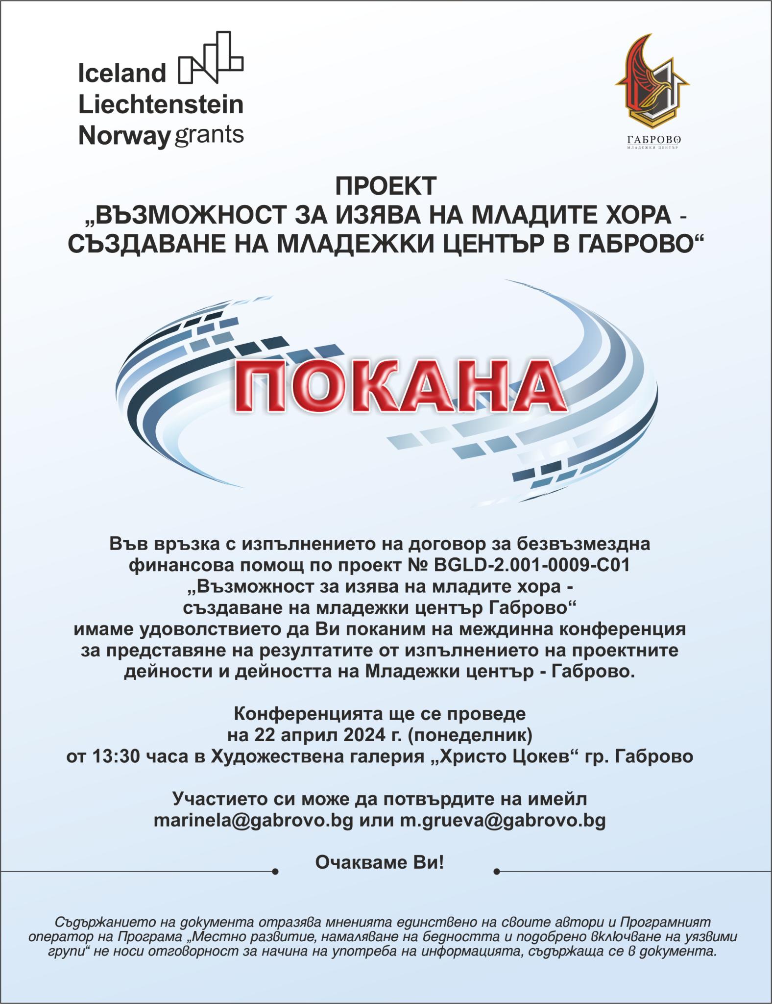 Проект № BGLD-2.001-0009 „Възможност за изява на младите хора – създаване на младежки център в Габрово“ се реализира по програма “Местно развитие, намаляване на бедността и подобрено включване на уязвими групи”, финансиран от ФМ на ЕИП 2014-2021.