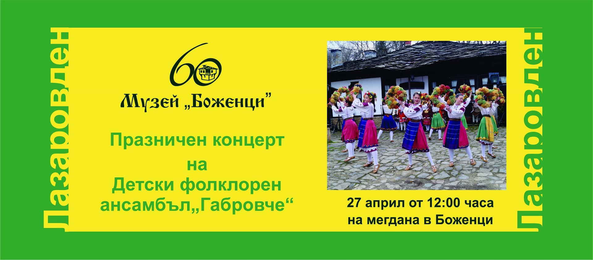 Общинският ансамбъл „Габровче“ ще изнесе празничен фолклорен концерт за Лазаровден в архитектурно-историческия резерват „Боженци“. От екипа на Музея канят всички почитатели на българската народна музика на мегдана в съботния 27 април от 12:00 часа. Талантливите певци и танцьори ще зарадват посетителите с пъстър букет от нашенски ритми, пролетни багри и много настроение.