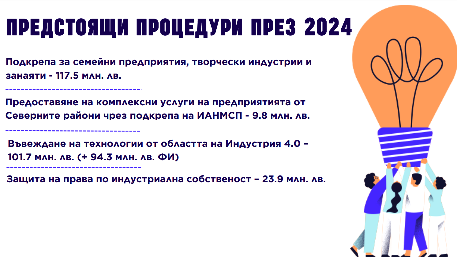 Експертите представиха детайли по възможностите за кандидатстване, дейностите, които ще се финансират, и целите на процедурата. С бюджет от 117,5 млн. лв. и възможности за финансиране от 15 000 до 150 000 лв., процедурата цели да насърчи инвестициите за подобряване на производствения капацитет и оптимизиране на бизнес процесите. Финансирането ще подпомогне закупуването на нови машини, оборудване, специализиран софтуер и създаването на онлайн магазини.