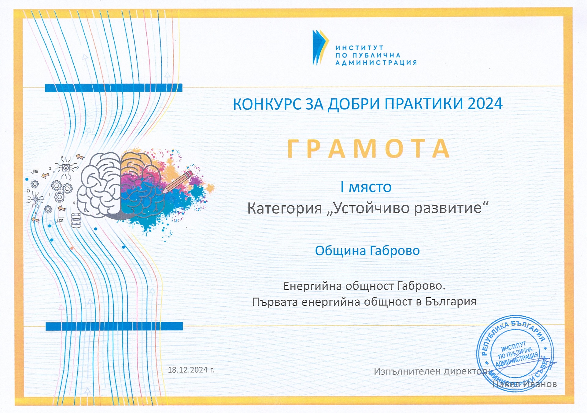 Първата енергийна общност в България, чийто инициатор е Община Габрово, спечели призовото място в категория „Устойчиво развитие“ на конкурса за добрите практики в държавната администрация за 2024 година.