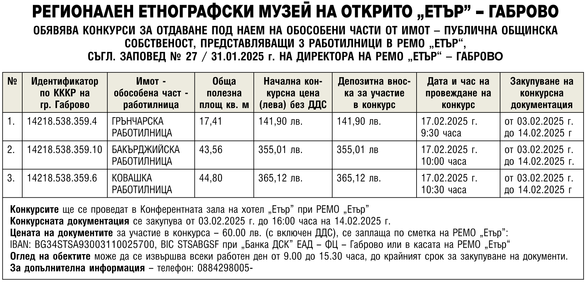 РЕМО "Етър" обявява конкурс за отдаване под наем на три работилници