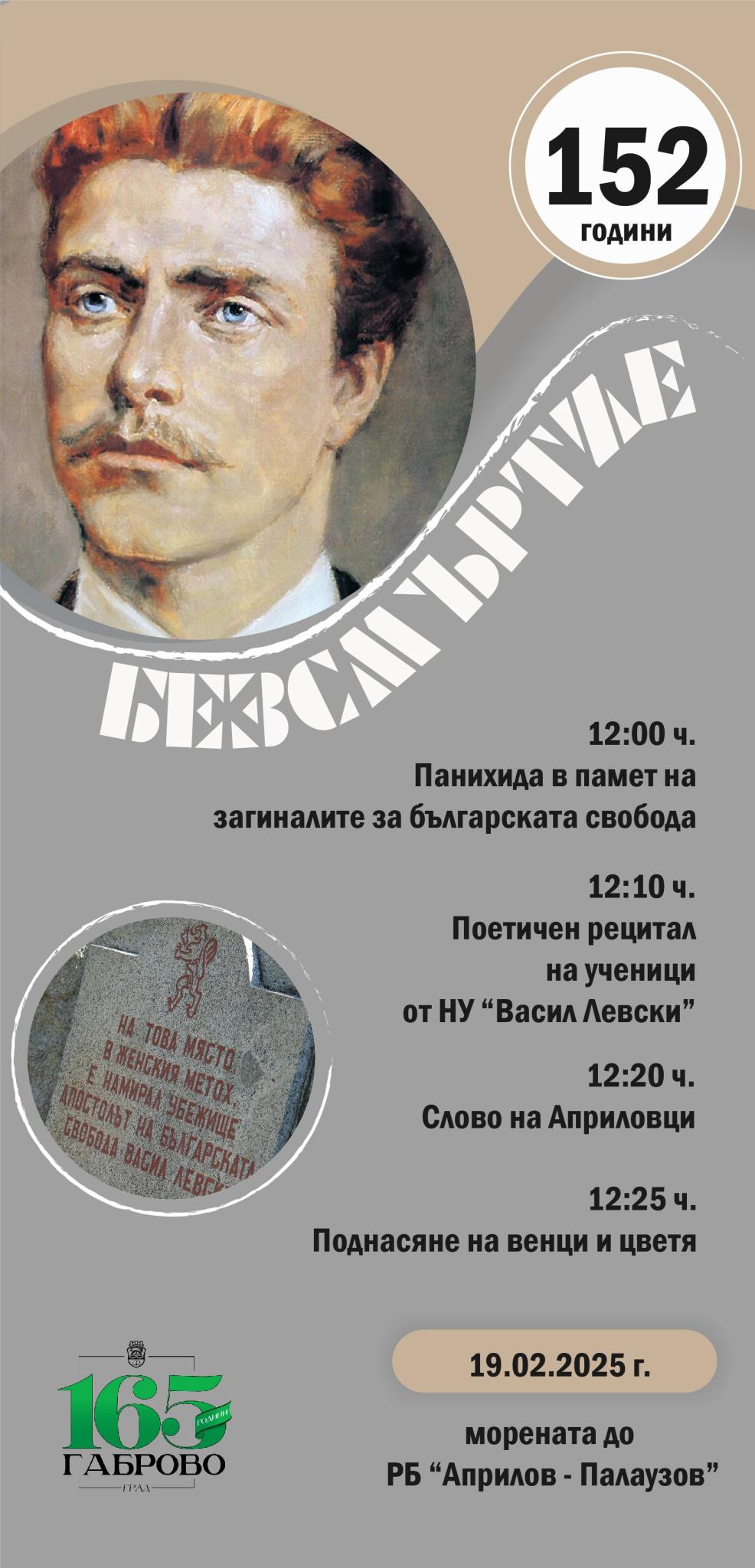 Община Габрово организира възпоменателна церемония по повод 152 години от гибелта на Васил Левски. На 19 февруари 2025 година от 12:00 часа пред морената в близост до РБ „Априлов – Палаузов, габровски свещеници ще отслужат панихида, а ученици от НУ “Васил Левски“ и Национална Априловска гимназия ще представят поетичен рецитал, с който ще почетем живота и делото на Апостола на свободата.