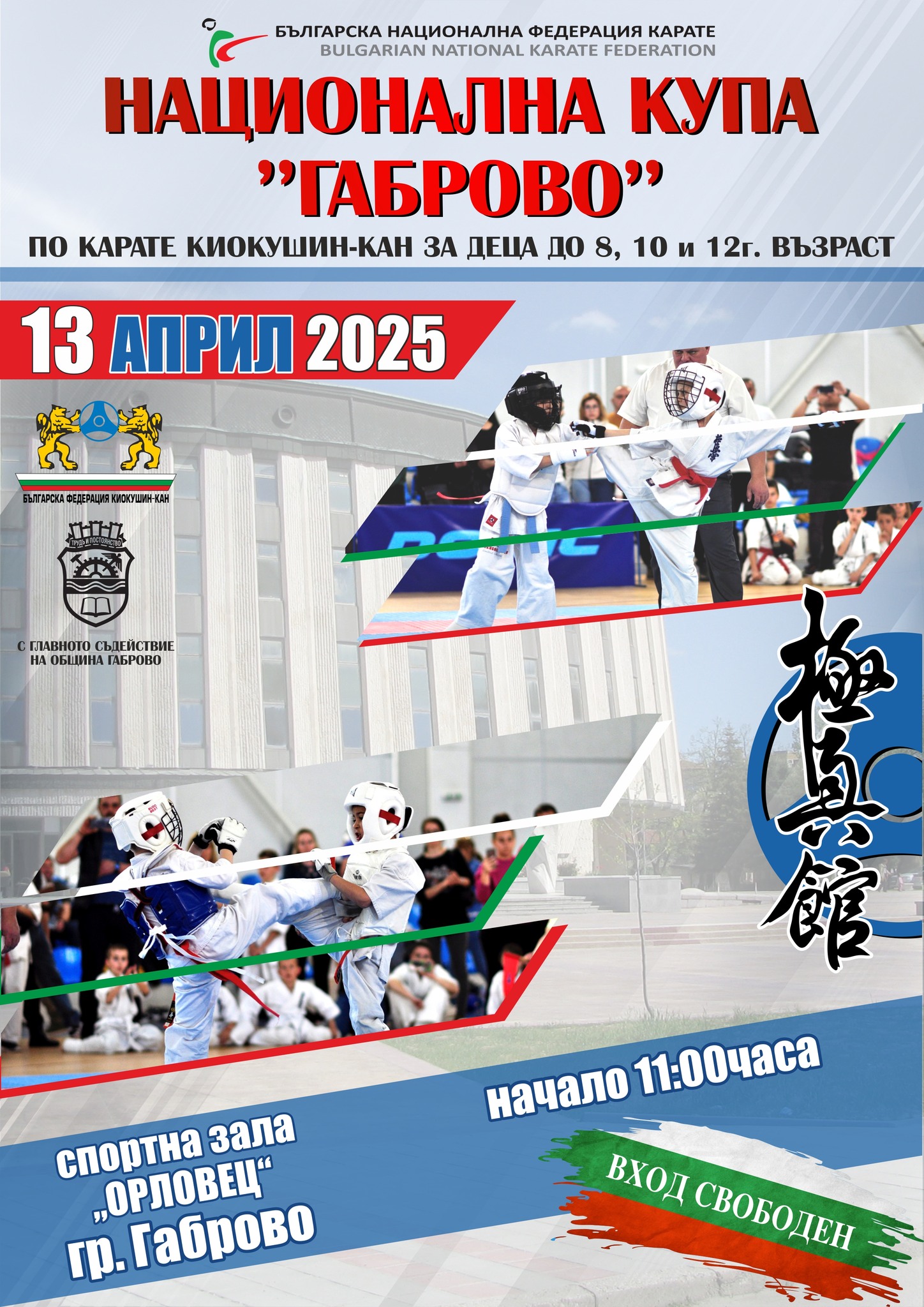 Зала „Орловец“ ще приеме Национална купа „Габрово“ по киокушин-кан тази неделя, 13 април. Проявата, организирана от СК „Киокушин“ (Габрово) със съдействието на Община Габрово, е за момчета и момичета на възраст до 8, до 10 и до 12 години. На татамито ще демонстрират уменията си деца от 13 клуба в страната – от Габрово, Павликени, София, Бургас, Русе, Черноморец, Ямбол, Асеновград, Нови Пазар, Ловеч, Монтана и Несебър.