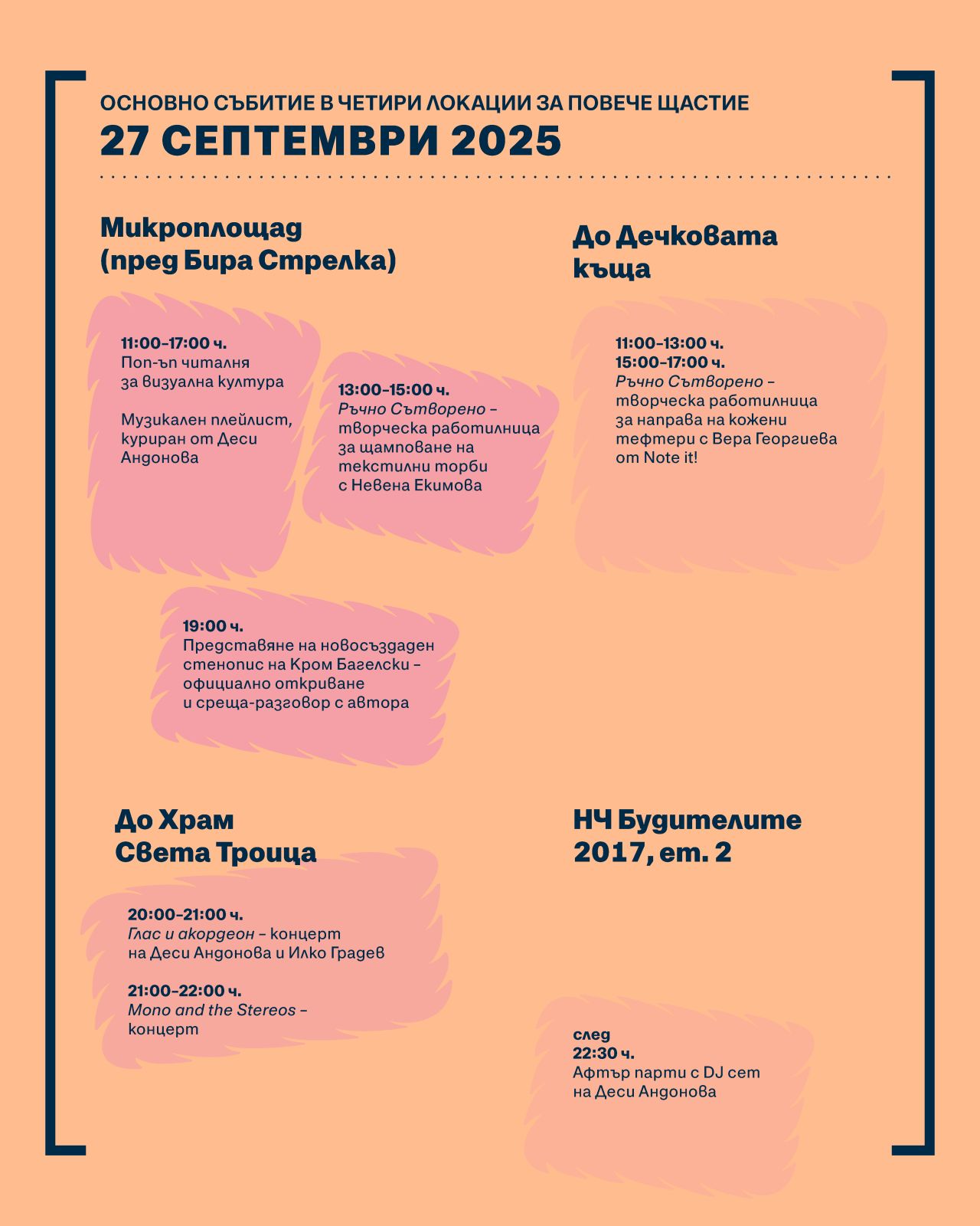 Тазгодишното издание се разполага на четири локации в кв. „Шести участък“ и започва точнo в 11 ч. до Дечковата къща с поредицата от работилници „Ръчно сътворено“ за изработка на кожени тефтери с Вера Георгиева, а от 13 ч. на микроплощада пред Бира Стрелка добре познатата габровска художничка Невена Екимова ще посвети публиката в тайната на щамповането на текстилни торби. Записването за нея става през онлайн формата на: tinyurl.com/33neh7z7. Точно в 19 ч. е обявено откриването на новосъздадения стенопис в присъствието на неговия автор художника Кром Багелски, което ще премине в среща-разговор с автора. Новото му произведение е вдъхновено от бубарството, дало поминък на няколко местни поколения в Шести участък и ще илюстрира този факт, красейки ключова фасада в квартала.