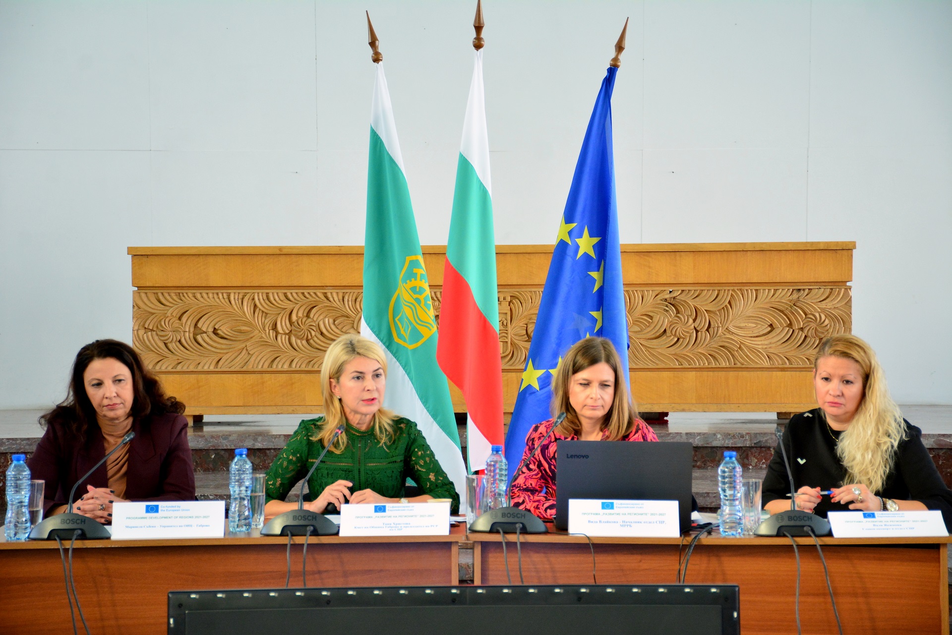 От ляво надясно: Управителят на Областен информационен център – Габрово Маринела Събева, кметът на община Габрово Таня Христова, началникът на отдел „Северен централен регион“ към МРРБ Вида Влайкова и гл. експерт в отдел „Северен централен регион“ Валя Якимова © Община Габрово