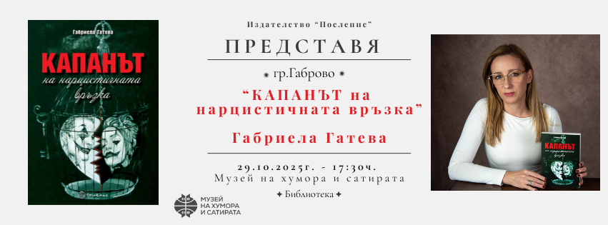 Книгата „Капанът на нарцистичната връзка“ на габровката Габриела Гатева ще бъде представена на 29 октомври 2025 г. – сряда, от 17:30 часа в библиотеката на Дома на хумора и сатирата. Новината съобщават от културната институция, която ще е домакин на срещата.