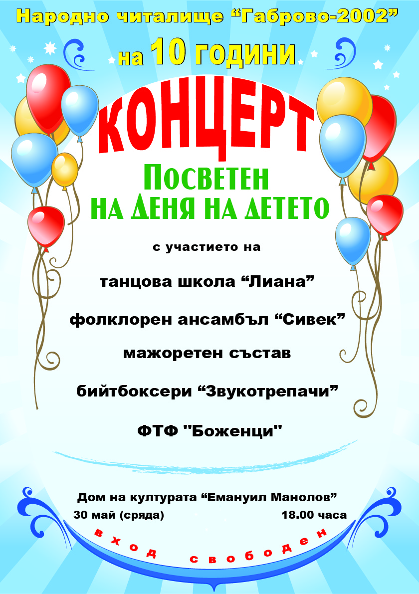 Тази вечер Народно читалище "Габрово 2002" ще отбележи Денят на детето с голям концерт в Дома на културата от 18 часа. Участие ще вземат всички детски състави на читалището - фолклорен ансамбъл "Сивек", танцова школа "Лиана", танцова формация "Боженци", мажоретки и най- новия състав на читалището " Звукотрепачи" - бийтбоксери. Входът е свободен.