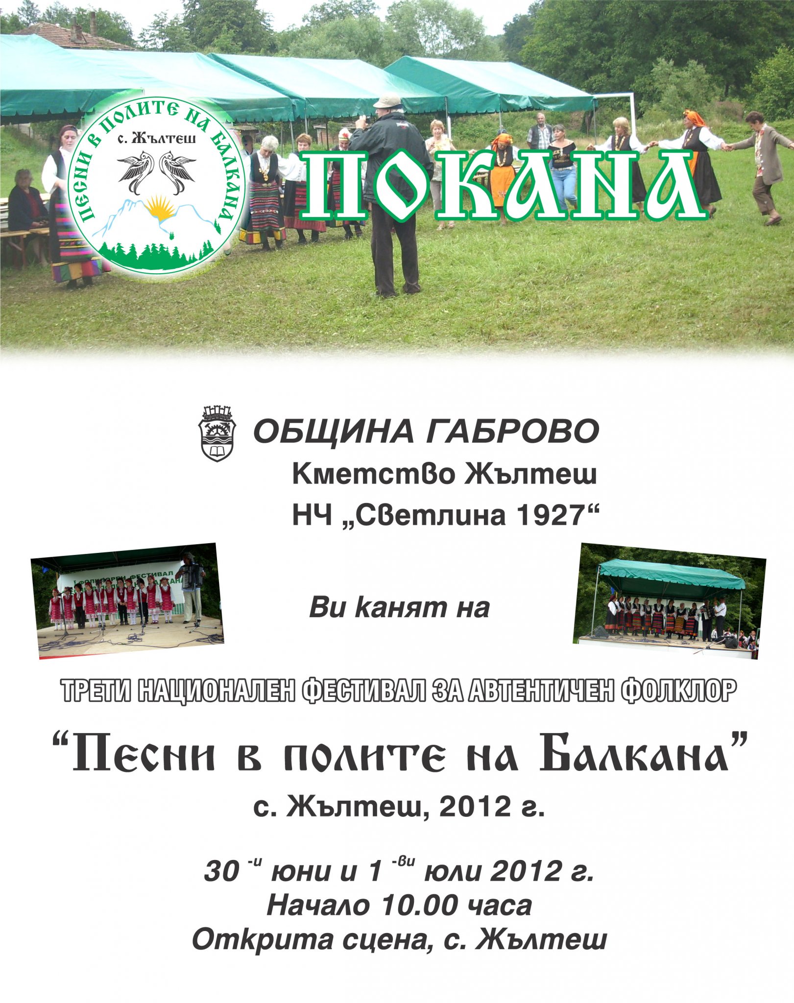 За трета поредна година Народно читалище "Светлина 1927" при кметство село Жълтеш кани любителите на автентичния фолклор на националния фестивал "Песни в полите на Балкана". На откритата сцена, разположена на поляната до реката ще вземат участие самодейни колективи от цялата страна. Началото е в 10 часа на 30 юни.