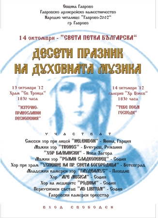 Десето издание на „Празник на духовната музика” организират на 13 и 14 октомври 2012 г. Община Габрово, Архиерейското наместничество и Народно читалище „Габрово – 2002”. Събитието се провежда в чест на 14 октомври – Деня на Света Петка Българска.