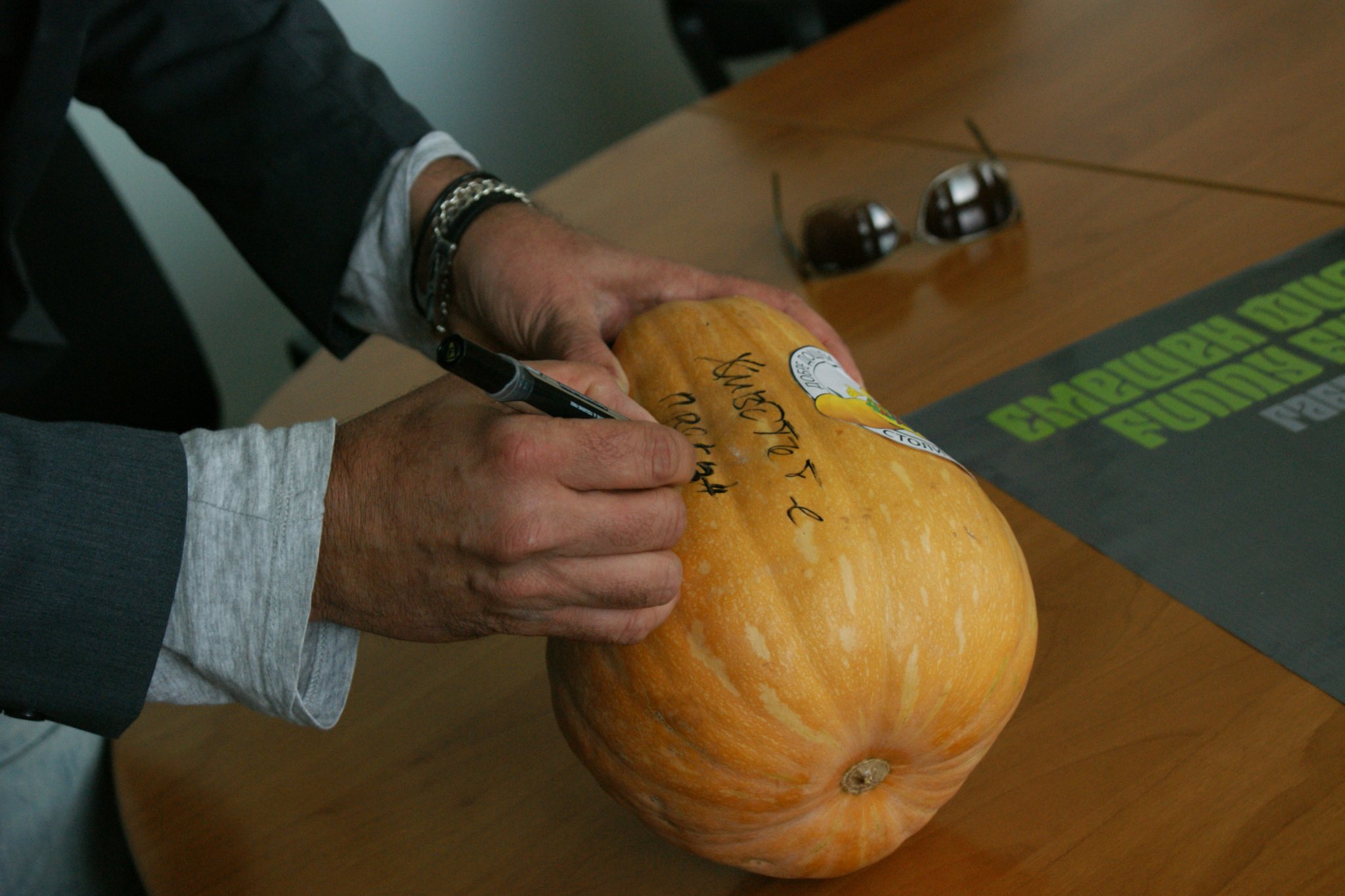Вчера, актьорът от хитовия български сериал „Седем часа разлика“, се срещна с Таня Христова, за да предаде покана за Празника на тиквата в Севлиево по доста нестандартен начин. Носейки две тикви, но не под една мишница, директорът на Сатиричния театър подари едната на кмета, върху която остави послание с автограф : „Животът е прекрасен“, а другата със забодени флаери, рекламиращи събитието, ще бъде поставена на открито.