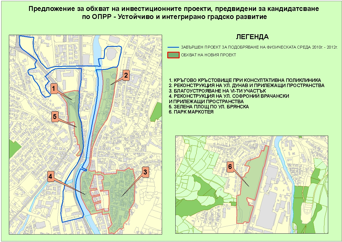 Предложените обекти включват ново кръгово кръстовище до Консултативна поликлиника и благоустрояване на зелената площ по ул. „Брянска“; благоустрояване на територията, прилежаща по десния бряг на р. Янтра от Спортна зала до Баев мост /включително улиците „Дунав”и „Софроний Врачански” и напречни улици, както и прилежащи пространства/; благоустрояване на „VІ участък”; цялостно обновяване на парк „Маркотея”.