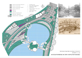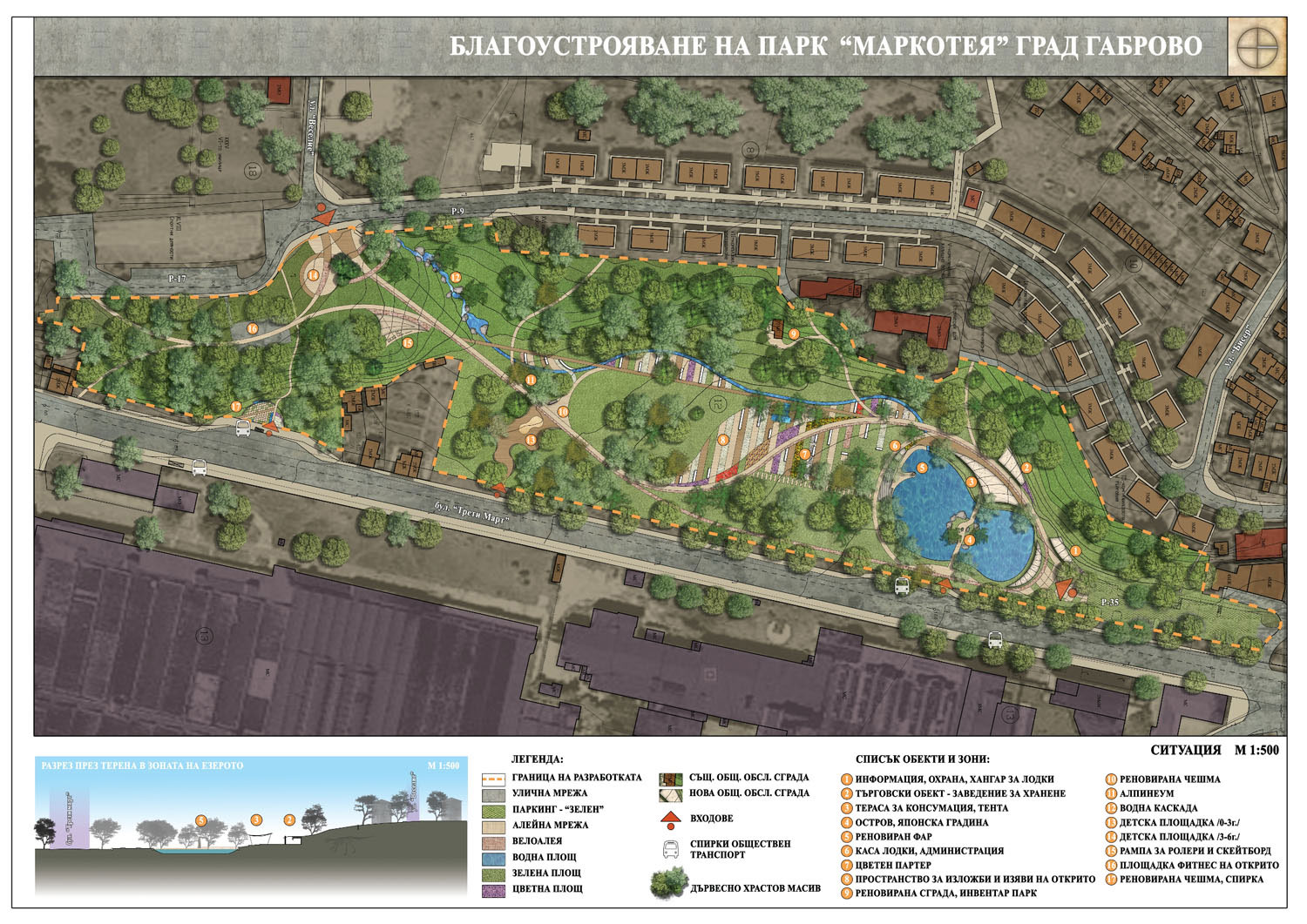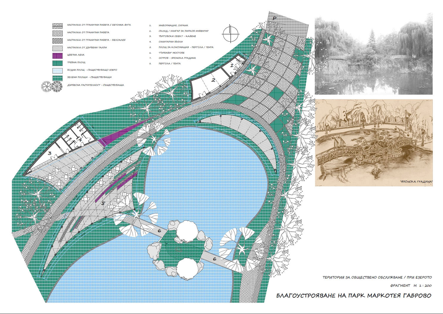 Обусловено от урбанистичните характеристики, проектът предлага ново зониране на парковата територия при минимална намеса в теренните дадености и максимално запазване на съществуващата дървесна растителност.