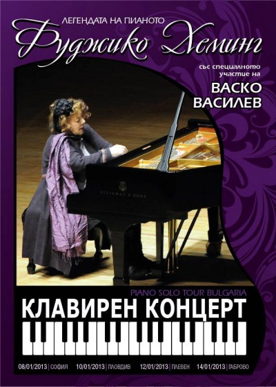 Японската легенда на пианото Фуджико Хеминг ще изнесе концерт на 14 януари в Габрово. Тя гостува в България по покана на известния наш цигулар Васко Василев, който също ще вземе участие в концерта. Началото е от 19 часа в Художествена галерия "Христо Цокев".