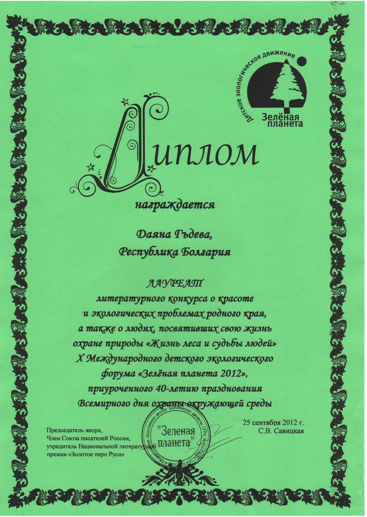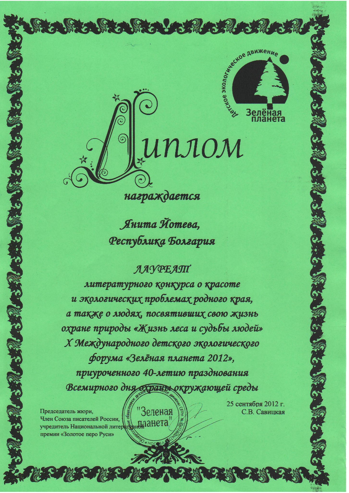 Международния детски екологичен форум „Зелена планета – 2012“ се провежда по инициативата на Общоруското обществено детско екологично движение „Зелена планета“ в рамките на международната му програма „Диалог на културите от запознанство към уважението“.