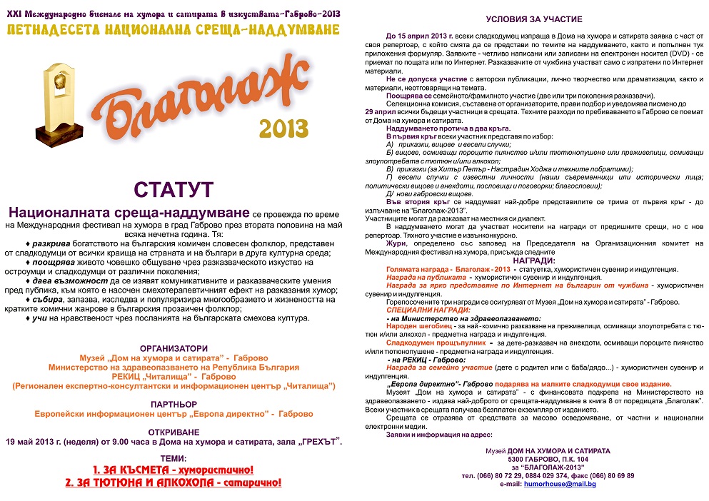 Музеят „Дом на хумора и сатирата”, заедно с Министерството на здравеопазването и РЕКИЦ – Габрово, вече се готвят за 15 Национална среща-наддумване „Благолаж”. Тя е част от Фестивала на хумора в Габрово и ще протече на 19 май 2013 г. от 9 часа в зала „Грехът” на ДХС. От Веселата къща канят всички, за които разказването на хумористични приказки, вицове, анекдоти и весели случки с реални лица е стихия и любимо занимание.
