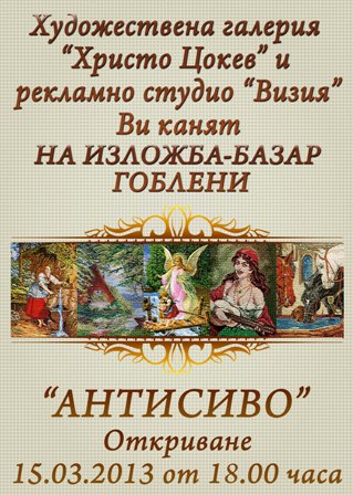 Експозицията под надслов „Антисиво” ще бъде открита на 15 март /петък/ от 18 часа. В нея ще бъдат показани над 50 гоблена, които са дело на 15 творци от Габрово. Идеята е да бъдат показани както класически образци, така и по-модерни и авангардни творби.