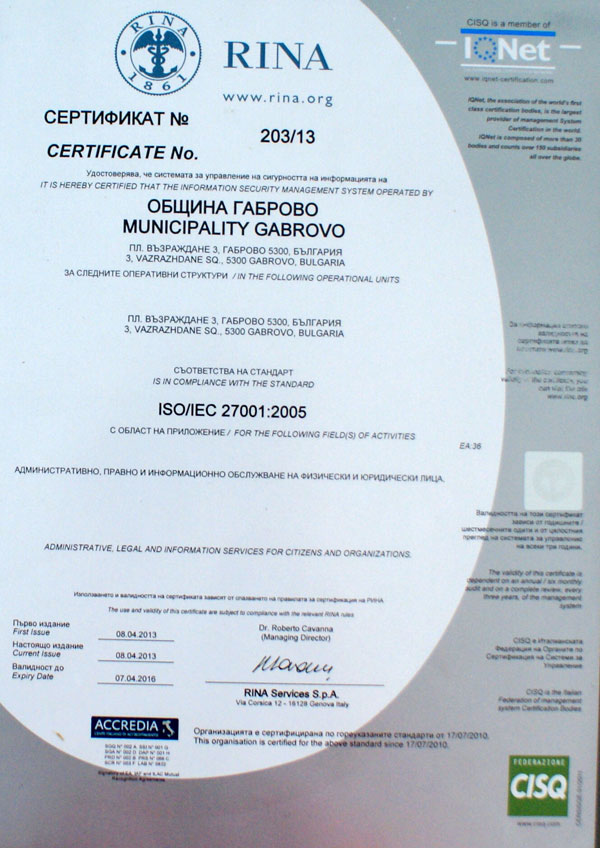 В ОБЩИНА ГАБРОВО е внедрена и успешно функционира Интегрирана система за управление - качество и сигурност на информацията, в съответствие с изискванията на ISO 9001:2008 и ISO/IEC 27001:2005.