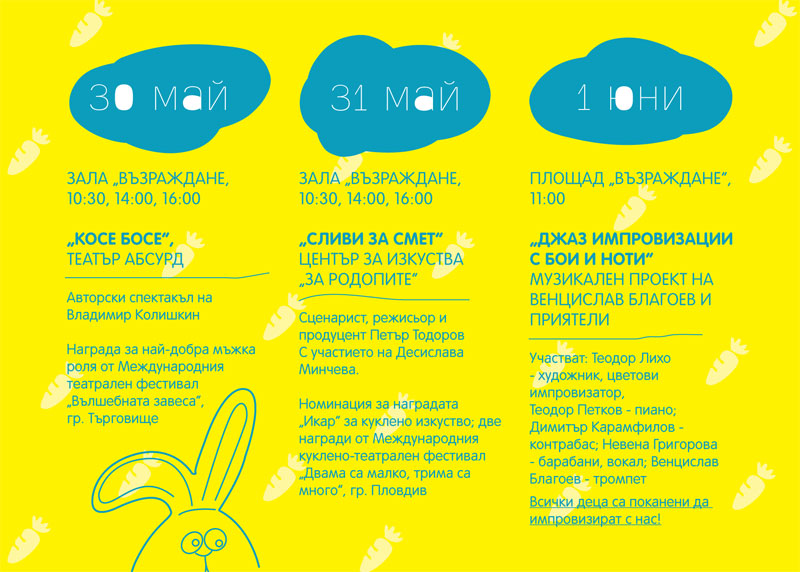 Реализацията му ще е в рамките на 3 дни - 30 и 31 май с куклени театрални спектакли в зала „Възраждане”, с по три представления на ден - от 10.30, 14.00 и 16.00 часа, а на 1 юни, както подобава на истински празник, от 11.00 часа на площад „Възраждане” ще звучи музика, ще се танцува и ще се рисува.