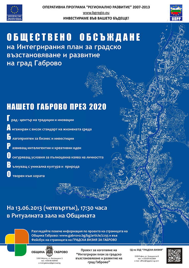 Публично обсъждане на Интегриран план за градско възстановяване и развитие на Габрово ще се състои днес, 13 юни 2013 г., от 17:30 часа в Ритуална зала на Общината.