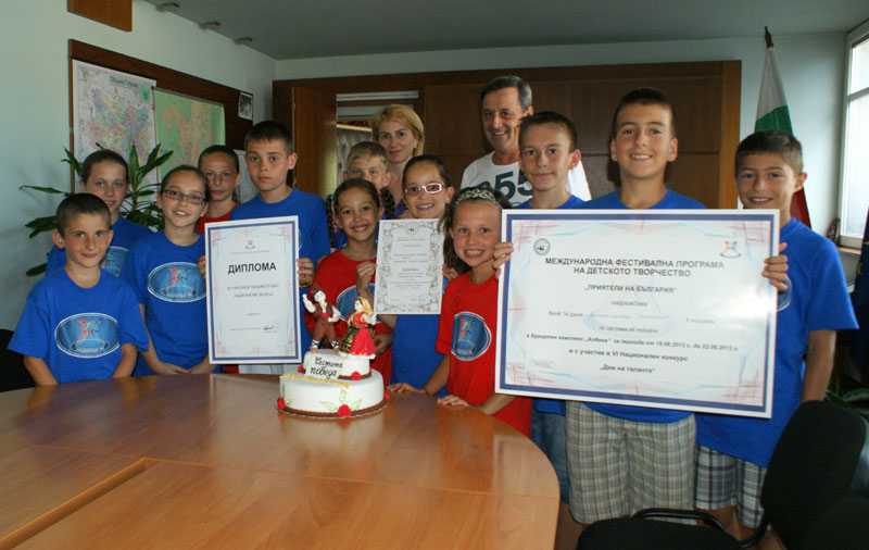 За спомен децата подариха на кмета на Община Габрово сувенир от почивката си в Албена, която бе тяхната наградата за победата в „Надиграй ме“ за деца. На свой ред получиха като награда за успеха си красива торта, върху която момиче и момче от фондан сякаш се надиграваха в ритъма на ръченица.