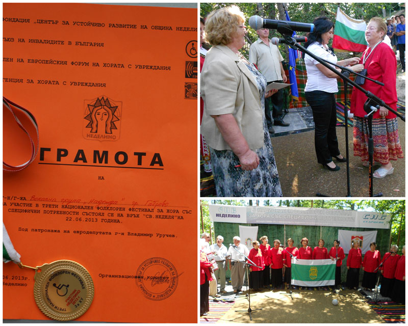 Със златен медал за цялостно представяне от Третия национален фолклорен фестивал за хора с увреждания се завърна вокална група „Надежда” при Дружеството на инвалидите и НЧ „Габрово 2002”. Формацията представи обработен фолклор, като освен в колективите изпълнение се включи и в индивидуалните с мъжко трио и дамски квартет.
