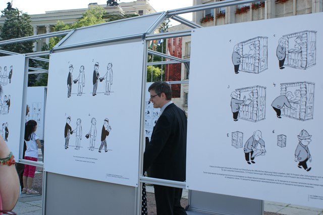 Габровци видимо се радваха на закачливите провокации, карикатури и пъстри акварели, усмихващи се от таблата, разположени на площада. За целта „колегиална подкрепа“ оказа мобилното експозиционно съоръжение „Спирката“, което е част от проекта „Габрово – индустрия за нова градска култура“.