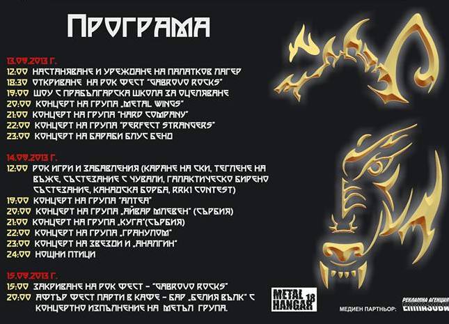 Тази година Габрово няма да се размине без Рок Фест и това е Gabrovo Rocks. Oт 13 до 15 септември в местността Янковски ливади почитателите на „истинската музика”, както я наричат организаторите на събитието, ще могат да чуят Antidot, Metal Wings, Hard Company, Perfect Strangers, Baraby Blues Band, Altea, Ajvar Mleven, Kuga, Granulom, Zvezdy & Analgin.