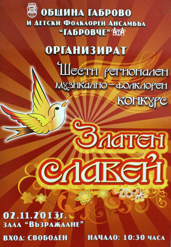 Община Габрово и ДФА „Габровче” Ви канят в събота, 2-ри ноември, от 10.30 часа в зала „Възраждане”, за да съпреживеете магията, която носи в себе си „Златен славей”.